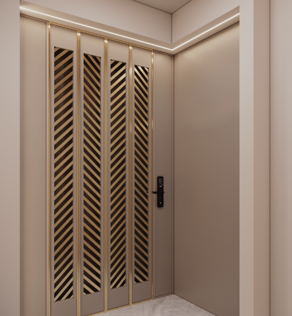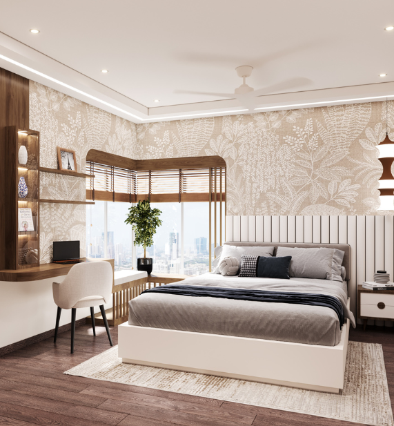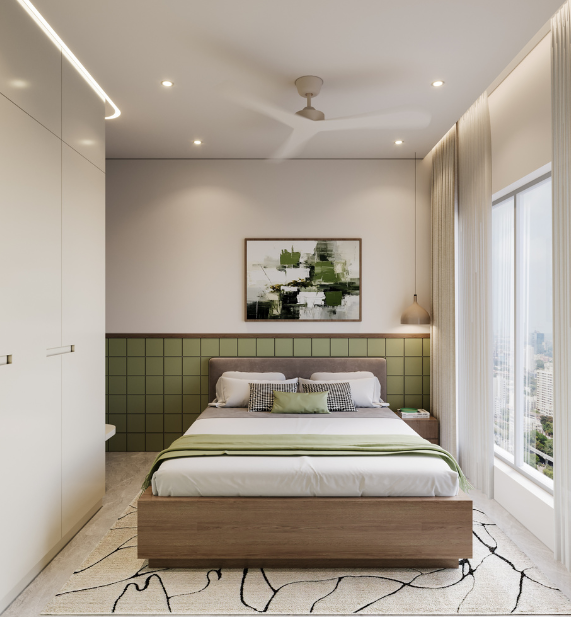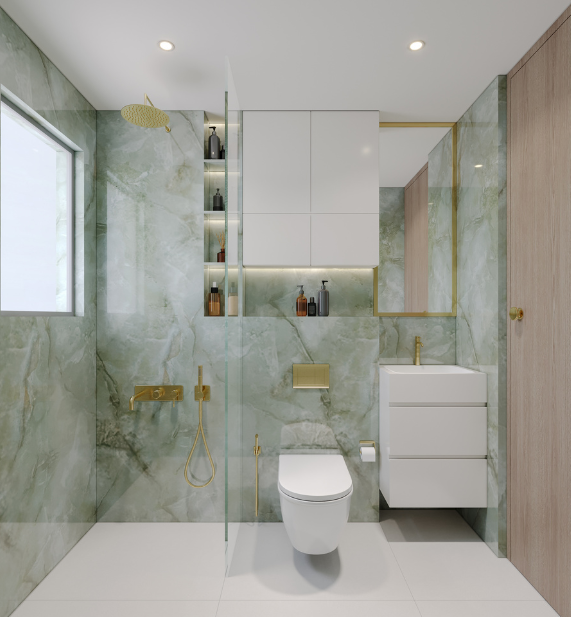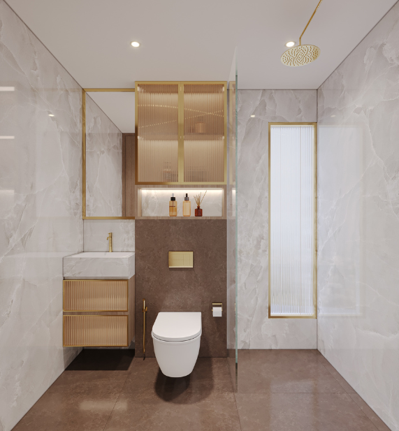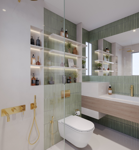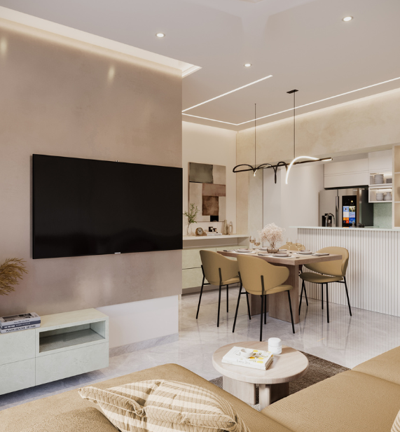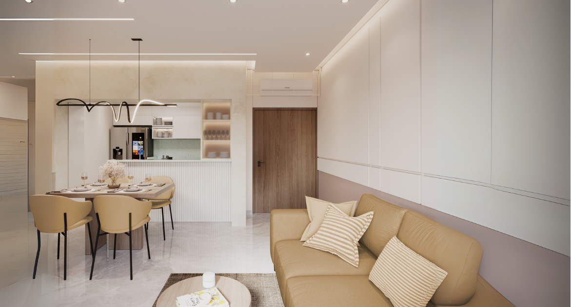 The kitchen design embraces a semi-open concept, delicately balancing openness with privacy. A thoughtfully carved-out opening visually connects the kitchen to the dining area —bringing in natural light, allowing interaction, and portraying a greater sense of volume — while smart zoning keeps work areas discreet and mess-free.